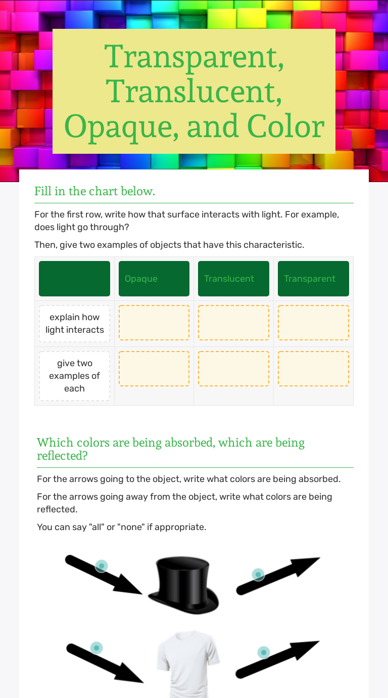 Transparent Translucent Opaque And Color Interactive Worksheet By Deanna Harrell Wizer Me - Clear window , transparent glassa translucent object lets only some light go through (not all)and forms a shadow that is very light eg a diamond crystal can occur in opaque, translucent, and transparent form.
